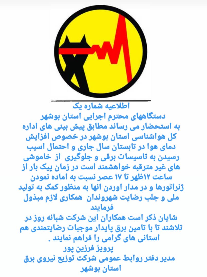 به استحضار می رساند مطابق پیش بینی های اداره کل هواشناسی استان بوشهر در خصوص افزایش دمای هوا در تابستان سال جاری، احتمال آسیب رسیدن به تأسیسات برقی و جلوگیری از خاموشی های غیر مترقبه، خواهشمند است در زمان پیک بار از ساعت ۱۲ الی ۱۷ عصر نسبت به آماده نمودن ژنراتورها و در مدار آوردن آنها به منظور کمک به تولید ملی و جلب رضایت شهروندان، همکاری لازم مبذول فرمایند.
