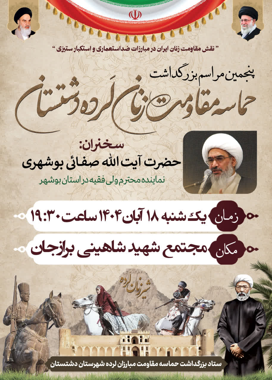 یحیایی با اشاره به جزئیات برنامه گفت: «پنجمین مراسم بزرگداشت حماسه مقاومت زنان لَرده دشتستان، با سخنرانی حضرت آیتالله صفایی بوشهری نماینده ولی فقیه در استان و امام جمعه بوشهر، یکشنبه ۱۸ آبان ۱۴۰۴ ساعت ۱۹:۳۰ در مجتمع شهید شاهینی برازجان برگزار می شود.