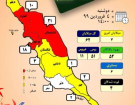 او افزود: از هفت بیمار جدیدی که نتیجه آزمایش کرونا ویروس آنها مثبت اعلامشده سه نفر ساکن شهرستان گناوه هستند که عبارتند از دو فرزند و عروس فردی که پیش از این آزمایش کرونا ویروس او مثبت بوده است. این افراد بستری نیستند، اما چون در تماس با مورد مثبت بودهاند و علایم سرماخوردگی داشتند از آنها نمونه گرفته و نتیجه آزمایش کرونا ویروس آنها مثبت شده است. این افراد در قرنطینه خانگی هستند.